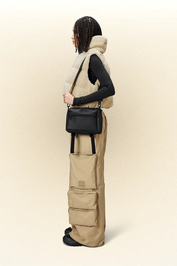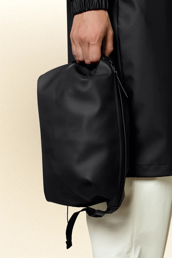 The Rains Hi Lo Wash Bag, the compact member of the Weekend Bag series, serves as a toiletry bag with a sleek waterproof design. Its minimal silhouette is enhanced by side-mounted buckles, offering adjustable compression to keep contents secure and optimize luggage space utilization. The bag features a spacious main compartment, providing ample room for daily wash and grooming essentials. Crafted from Rains' distinctive waterproof PU fabric, the Weekend Wash Bag is designed for enduring carrying strength, durability, and a luxurious smooth feel.