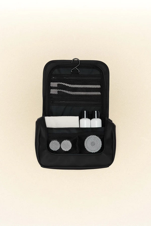 The Rains Texel Wash Bag presents a remarkably practical design to accommodate all your bathroom essentials seamlessly. Unveiling its functionality, the zipped bi-fold cover opens to reveal a main compartment equipped with two slip pockets and an elastic storage band tailored for small travel bottles. The folded cover boasts two additional zip pockets and a fold-out hanger, facilitating easy access when the bag is hung open. Completed with a padded carry handle, the Texel Wash Bag is crafted from Rains' distinctive waterproof PU fabric, known for its robust carrying strength, durability, and smooth texture.